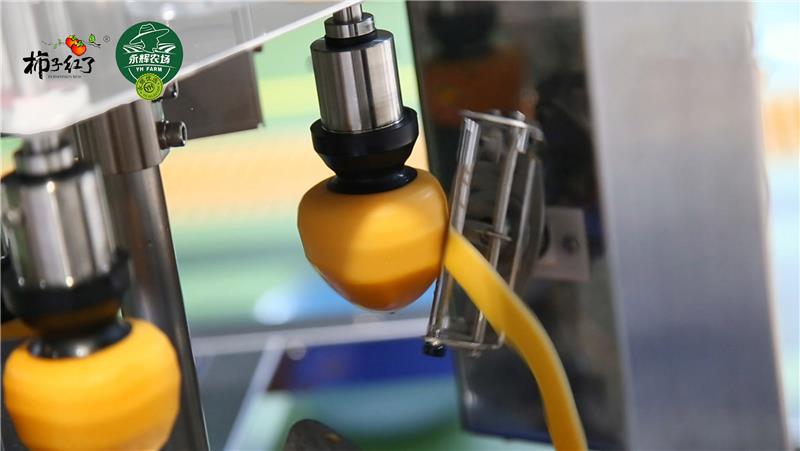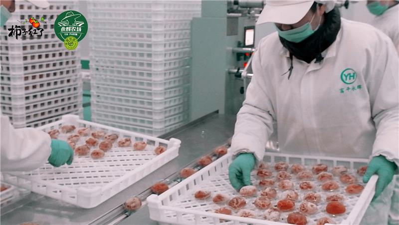 在富平永輝的柿子產業園內,一排排橙紅飽滿的富平尖柿正在經歷一趟奇妙的高科技旅程,光電智能分選、鮮果全自動削皮、五段式智能烘干,通過將現代技術與傳統工藝相結合,最快僅需20天,粉厚霜白、甜嫩軟糯的富平柿餅即可新鮮出爐,口感與傳統手工制作幾乎無差,且生產過程全程清潔無塵化,生產效率大大提高。