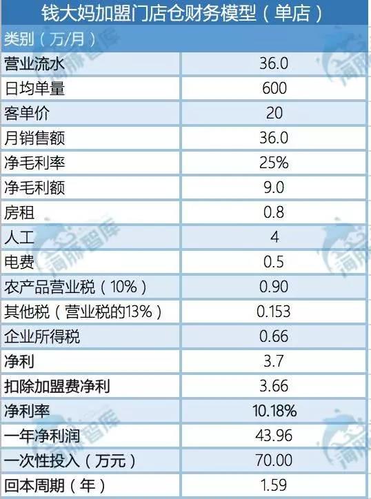錢大媽加盟店單店財務模型 數(shù)據來源:公開信息整理