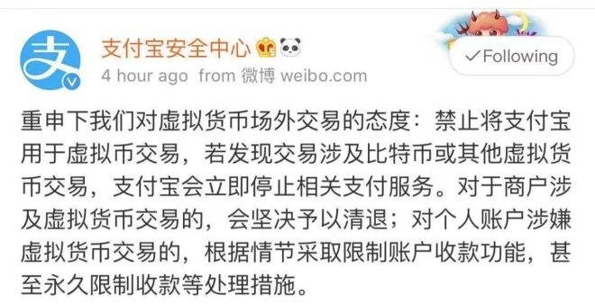 同一日,支付寶安全中心也通過官方微博發文重申對虛擬貨幣場外交易的態度。支付寶稱,若發現交易涉及比特幣或其他虛擬貨幣交易,支付寶會立即停止相關支付服務。對于商戶涉及虛擬貨幣交易的,會堅決予以清退;對個人賬戶涉嫌虛擬貨幣交易的,根據情節采取限制賬戶收款功能,甚至永久限制收款等處理措施。
