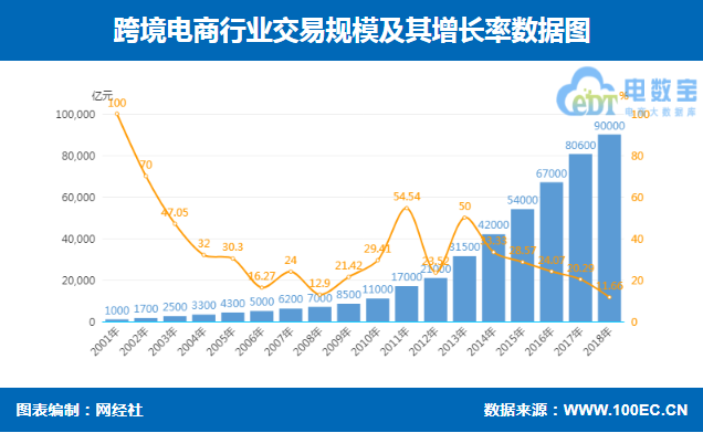 11月5日,網經社電子商務研究中心發布的《2019年全球電子商務數據報告》顯示,2018年中國跨境電商行業交易規模達90000億元,同比增長11.6%。其中,出口電商交易規模為7.1萬億元,進口電商交易規模達1.9萬億元,同比增長26.7%。