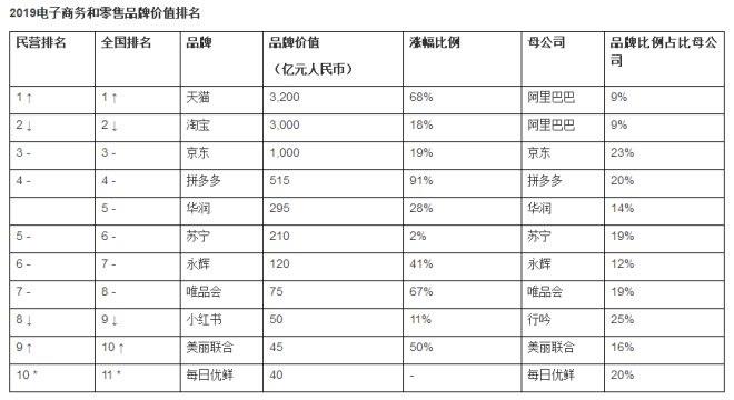 阿里巴巴共7個品牌上榜,成為上榜品牌數(shù)量最多的母公司,排名前三的是天貓、淘寶和菜鳥。騰訊有3個品牌上榜,分別是微信、騰訊和QQ。洋河股份有3個品牌上榜,分別是夢之藍、天之藍和海之藍。