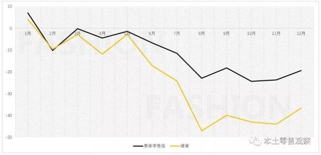 12月,香港零售業時尚相關行業悉數繼續暴跌,服裝、百貨公司、鞋類和有關制品及其他衣物配件、眼鏡店和藥妝銷售分別下跌22.1%、25.3%、20.4%、19.3%和29.9%;2019年全年上述類別跌幅分別為14.6%、13.0%、11.3%、13.8%和13.2%。
