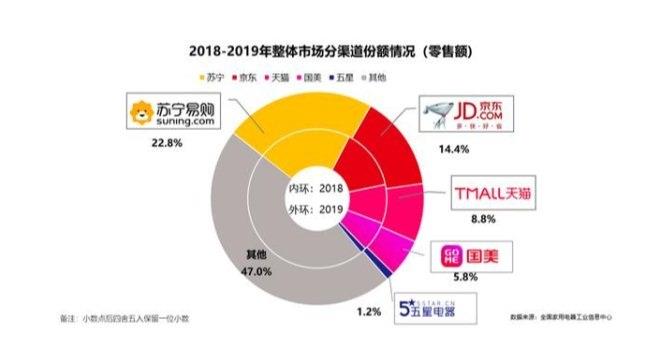 從全渠道的銷售數據來看,得益于線上線下協同發展,蘇寧易購在整個家電市場份額為22.8%,京東(14.4%)、天貓(8.8%)、國美(5.8%)、五星電器(1.2%)分別位列二至五名。