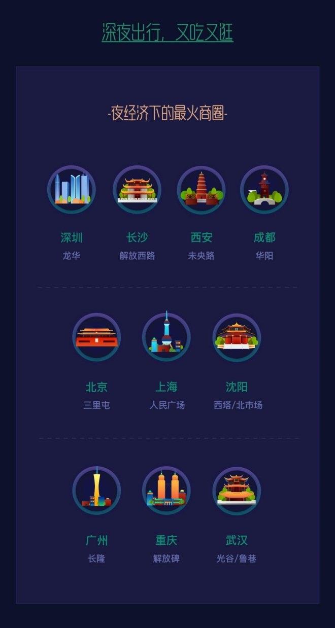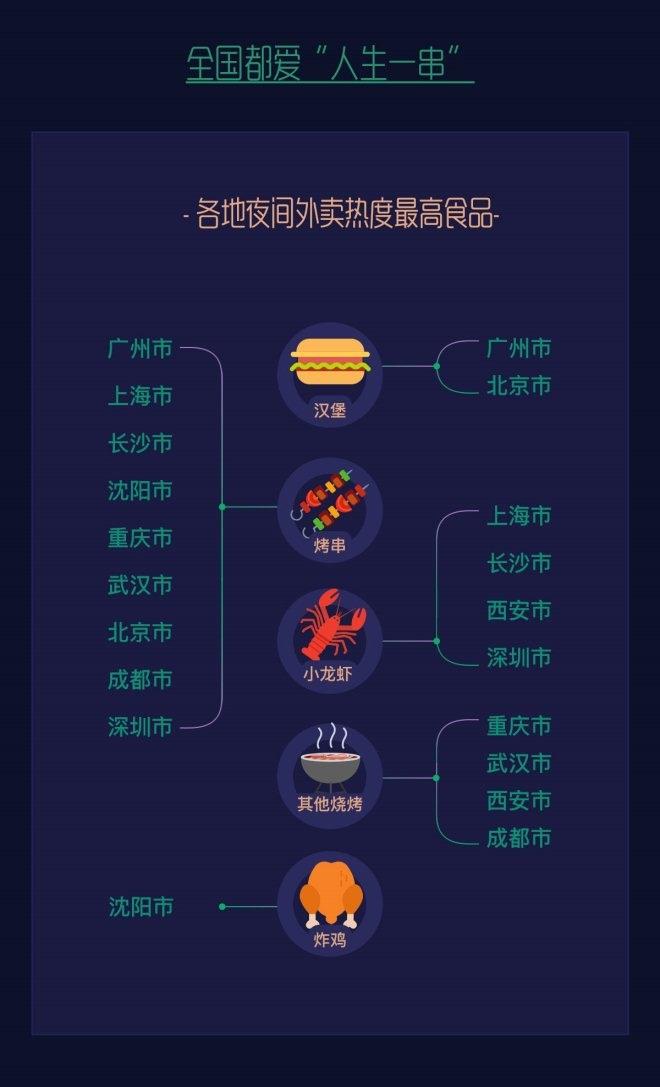 烤串成為多個(gè)城市美團(tuán)用戶最愛的夜間外賣。面包甜點(diǎn)、小龍蝦、火鍋、奶茶等其他宵夜品類也有明顯增長(zhǎng),折算成等價(jià)食物,約等于北京人民吃掉33萬(wàn)串烤串,武漢人民吃掉22萬(wàn)串烤串,上海人民吃了24萬(wàn)只小龍蝦,逛吃逛吃”成為夜晚首選。北京人民最愛三里屯,重慶人都去解放碑。