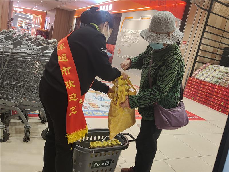 比如,在門店入口,永輝會專門安排協調能力較強的員工,主動在入口處為消費者提供購物籃、購物車,及時幫助有需求的顧客解決問題。